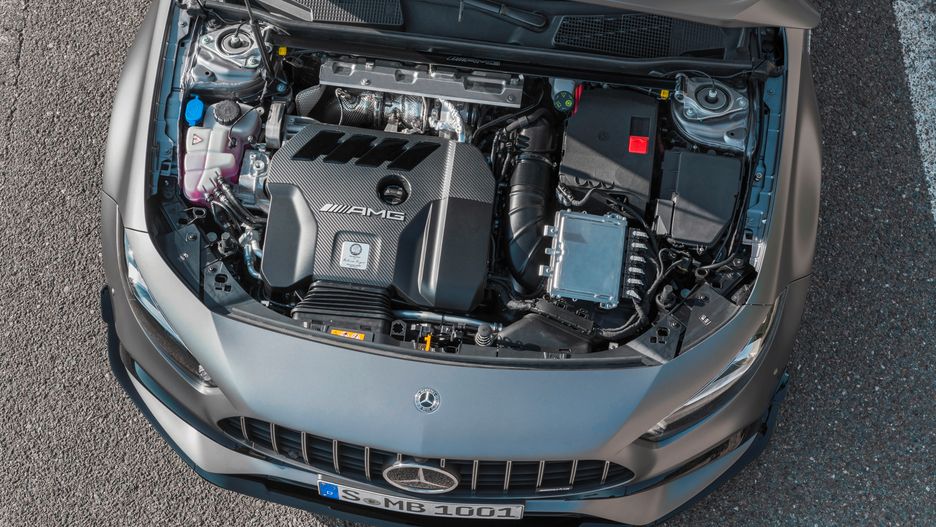 O rzekomym zestawie napędowym w nowej Klasie C od AMG donosi Autocar. Silnik spalinowy o pojemności 2 litrów ma pochodzić z AMG A45 S. Fabrycznie generuje moc 421 KM, ale w C63e zostanie wyposażony w elektryczną turbosprężarkę rodem z Formuły 1 oraz generator-rozrusznik 48V. Już samo to go "usprawni", nawet jeśli wartości maksymalne nie będą większe.