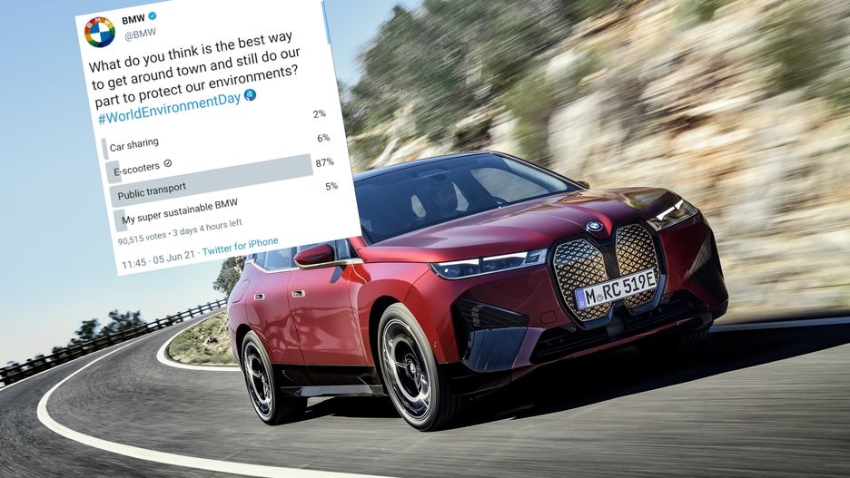 W ostatnich dniach BMW zapytało na twitterze o to, w jaki sposób można jednocześnie poruszać się po mieście i dbać o środowisko? Być może jest to car-sharing, elektryczne skutery, publiczny transport czy też – uwaga – "moje super zrównoważone ekologiczne BMW". Tak, naprawdę do wyboru była taka opcja.