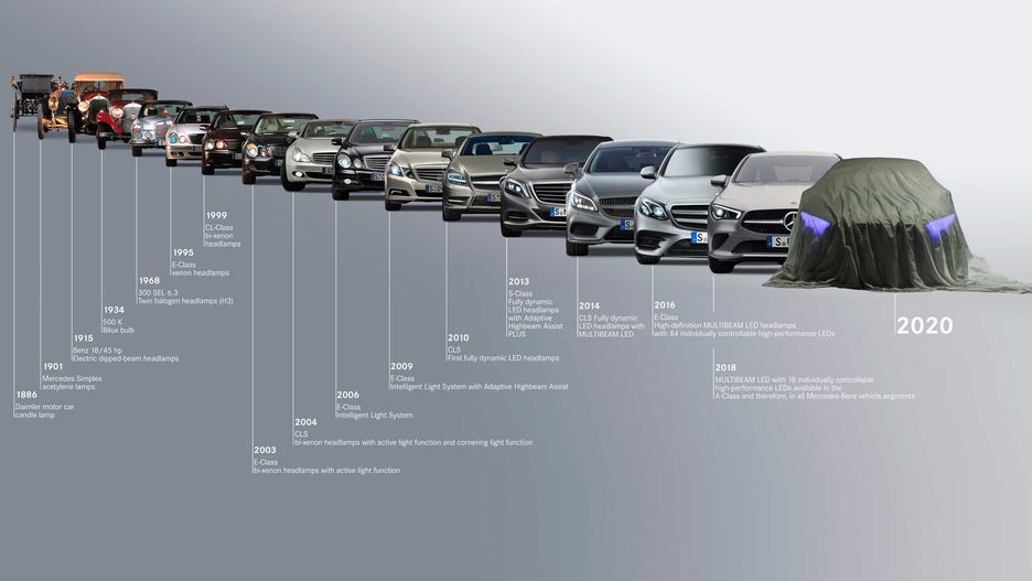 Tak przynajmniej wynika z grafiki opublikowanej przez Mercedesa. Co prawda dotyczy ona ewolucji oświetlenia w poszczególnych generacjach limuzyn niemieckiego producenta, lecz ostatnim autem, przy którym zapisano "2020" wydaje się być właśnie EQS. Choć nadwozie przykryto półprzezroczystą płachtą, nietrudno zauważyć prześwitujące spod niej reflektory o charakterystycznym kształcie, pokrywające się z tym, co znamy z konceptów marki oraz zdjęć szpiegowskich.