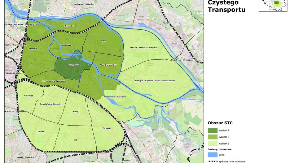 Pierwszy z nich obejmuje tylko ścisłe centrum miasta, czyli obszar wewnątrz Fosy Miejskiej i Odry. Autorzy raportu stwierdzają, że takie rozwiązanie nie spełni swojego zadania. Zalecają więc oparcie strefy na nasypie kolejowym przy Dworcu Głównym i zamknięcie jej od północy przez Starą Odrę. Wariant maksymalny to włączenie zabudowy mieszkaniowej (Gaj, Huby, Tarnogaj, Powstańców Śląskich, Borek, Biskupin, Sępolno i Zalesie). Co ciekawe, to rozwiązanie nie jest rekomendowane – są tam m.in. odcinki dróg krajowych.