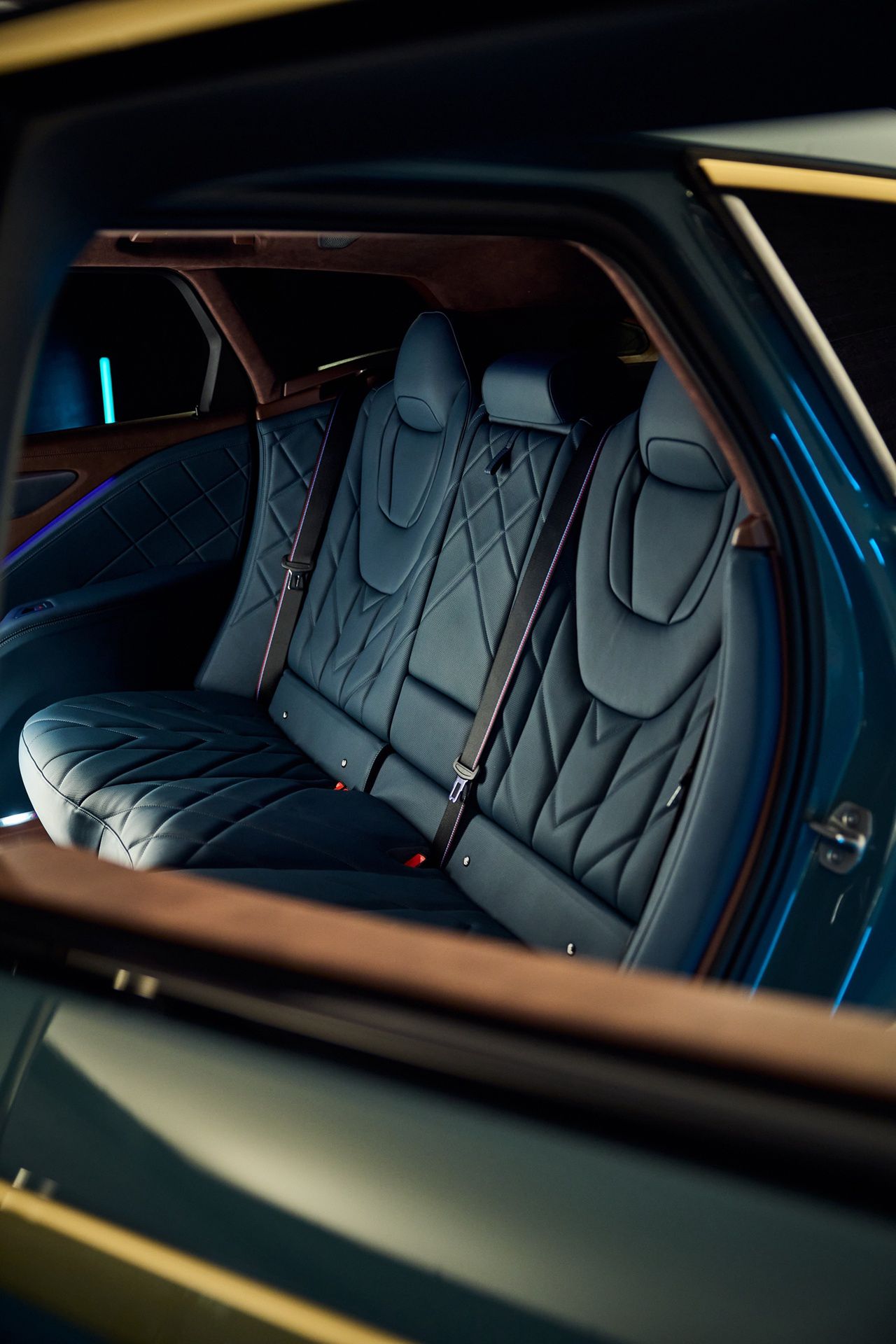 Pikowana skóra tylnej kanapy jest przeciągnięta na drzwi tak, że można odnieść wrażenie, że siedzimy na bardzo miękkiej sofie. To nie jest sportowo zabudowana przestrzeń pasażerska, tylko naprawdę komfortowe miejsce na długie podróże. Górną część obić uzupełnia opcjonalna skóra Vintage, obrobiona tak, by wyglądała na lekko zużytą – na żywo jest to fantastyczny zestaw, bardzo mięsisty, przyjemny w dotyku i wyglądający luksusowo, nie tylko premium.